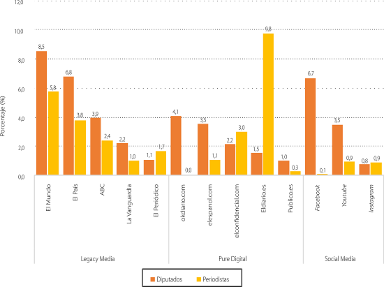 De los datos presentados en este estudio se obtiene una última conclusión: los medios nativos digitales tienen una presencia relevante entre los referentes de los políticos, pero los convencionales siguen teniendo todavía un gran peso, principalmente los periódicos impresos. Los principales diarios españoles como El País, El Mundo, La Vanguardia o ABC siguen siendo los referentes de los políticos y los que estos perciben como principales formadores de opinión, cuando en realidad existe un universo digital muy alejado de estos grandes medios, los cuales han dejado de ser referentes para la mayor parte de los usuarios de las redes sociales.