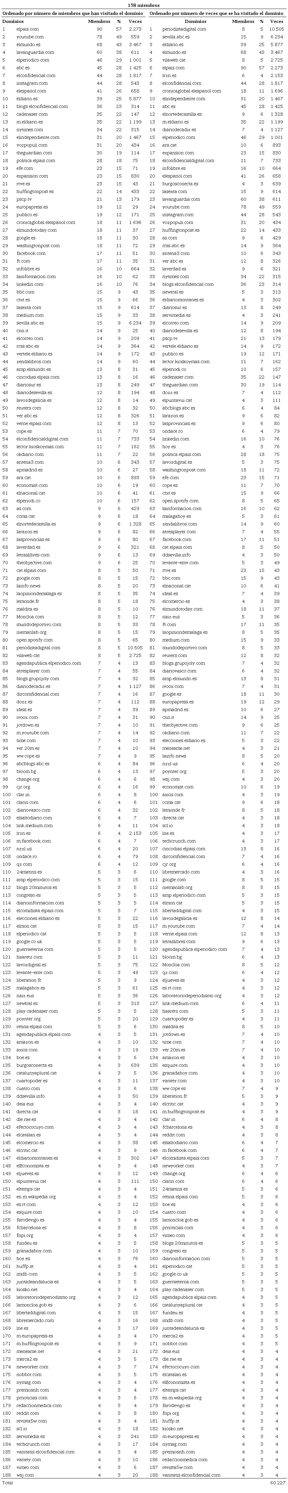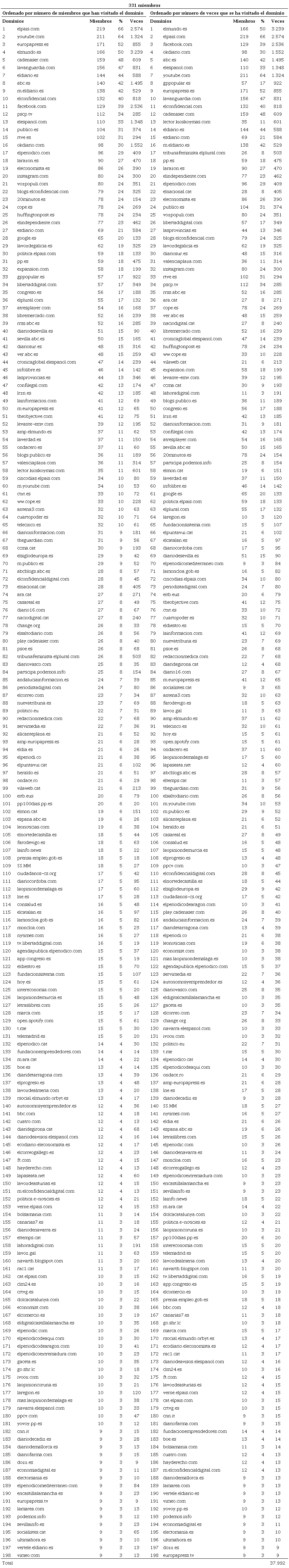 No se observan diferencias destacables en cuanto a la difusión de los dominios de los medios nativos digitales entre los compartidos por más miembros y los compartidos más veces: Eldiario.es, elconfidencial.com, elespanol.com, publico.es y okdiario.com encabezan por este orden los sitios web compartidos por más miembros, y los cuatro compartidos más veces son, también por orden, okdiario.com, elespanol.com, elconfidencial.com y el diario.es. La web de publico.es, sin embargo, sí aparece en posición más alejada (la 24ª) en la lista de las webs más veces compartidas.