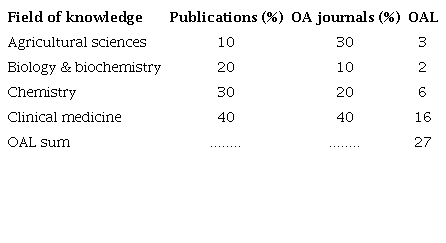 The partial value of OAL for Agricultural Sciences (3) is calculated as the percentage that the percentage of publications in that field (10) represents with respect to the % of OA journals available in that field (30), i.e., the 10% of 30.
