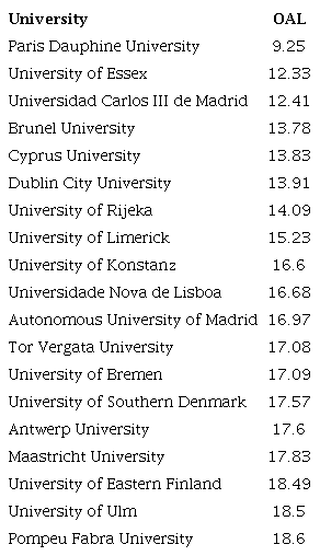 For the universities studied, the number of fields for which the OA availability is below the mean, from the 10 fields in which the university has more published articles ranges from 5 (University of Eastern Finland, Antwerp University, and Pompeu Fabra University) to 9 (Cyprus University). This is indicative of important differences in the availability of OA journals in the fields of specialization for the different universities.