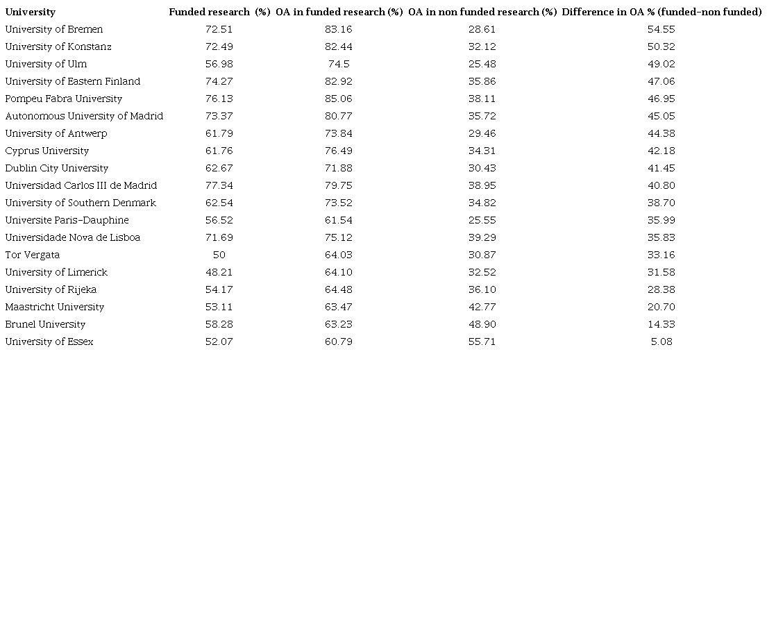 The percentages of funded research range from 52% in the case of the University of Essex to 72.5% in the case of the University of Bremen. The differences in the percentages of OA in funded research and non-funded research are congruent with those found in the literature (Table 4).
