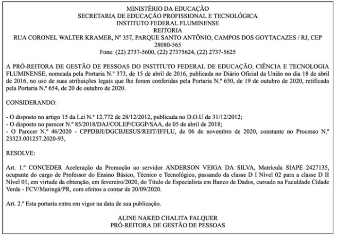 Como exemplo, o Instituto Federal Fluminense (IFF) é uma das diversas instituições federais de ensino existentes no Brasil que publica as portarias emitidas no formato de documento de texto. Nesse caso, as portarias são divulgadas no endereço eletrônico do Centro de Documentação Digital (CDD) e, através de um levantamento próprio realizado nesse endereço, pode-se constatar que, apenas no ano de 2019, cerca de 2500 portarias foram publicadas. Essa grande quantidade de portarias possui conhecimentos importantes subjacentes que estão obscuros em documentos de texto, sem qualquer tipo de organização formal. As portarias possuem itens que determinam qual a sua finalidade ou seu tipo, quais servidores são citados, a data de sua publicação, dentre outras informações específicas de cada tipo de portaria. Para realizar uma consulta que retorne todas as portarias de progressão e promoção relacionadas a um determinado servidor, por exemplo, é preciso realizar o trabalho manual de verificação do conteúdo de cada documento até encontrar todos os que satisfaçam os critérios dessa busca.