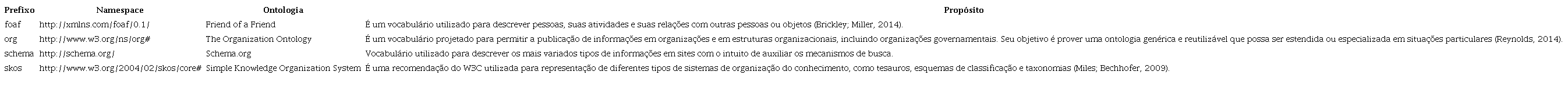 O Quadro 1 apresenta cada uma das ontologias reutilizadas no desenvolvimento deste trabalho, associadas aos seus respectivos prefixos e namespaces.