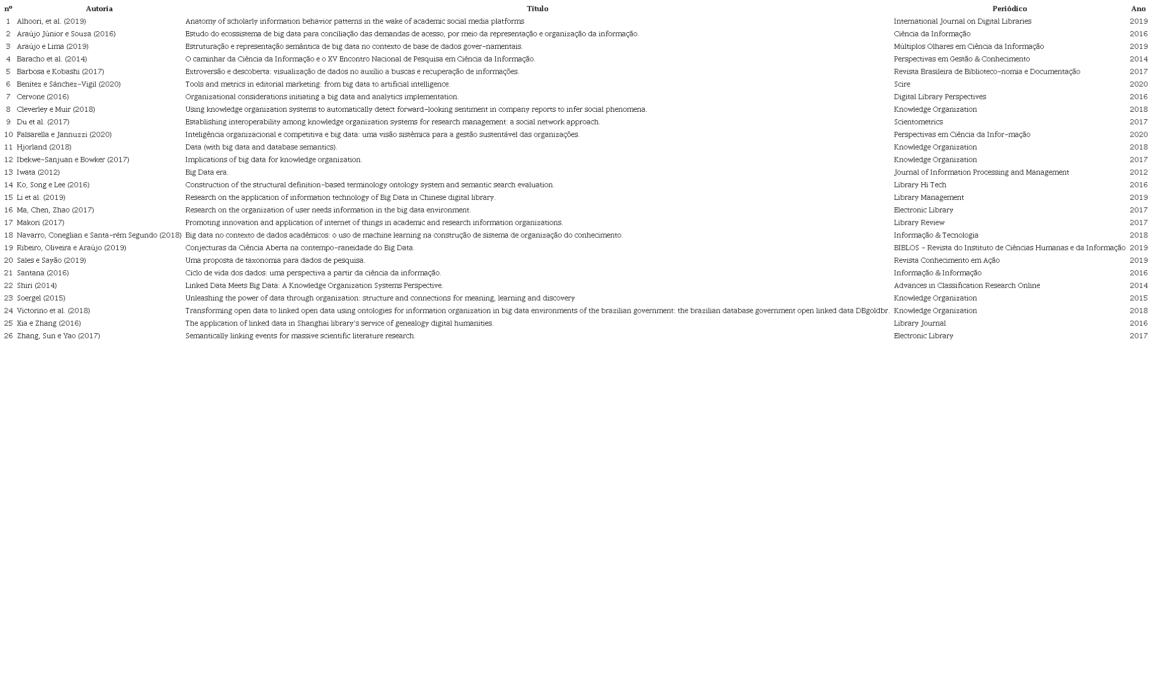 Após essa verificação, foi realizada a leitura dos títulos, resumos e palavras-chave dos artigos, objetivando confirmar se eles realmente possuíam correspondência com a busca realizada, reduzindo, assim, possíveis inconsis-tências. O total de artigos recuperados foi de 47 e, após a verificação da sobreposição, sobraram 30. Destaca-se que quatro artigos foram retirados do universo de pesquisa por não apresentarem discussões diretamente relacionadas a Big Data. A amostra final da pesquisa conta, então, com 26 artigos que estão relacionados na Tabela 1.