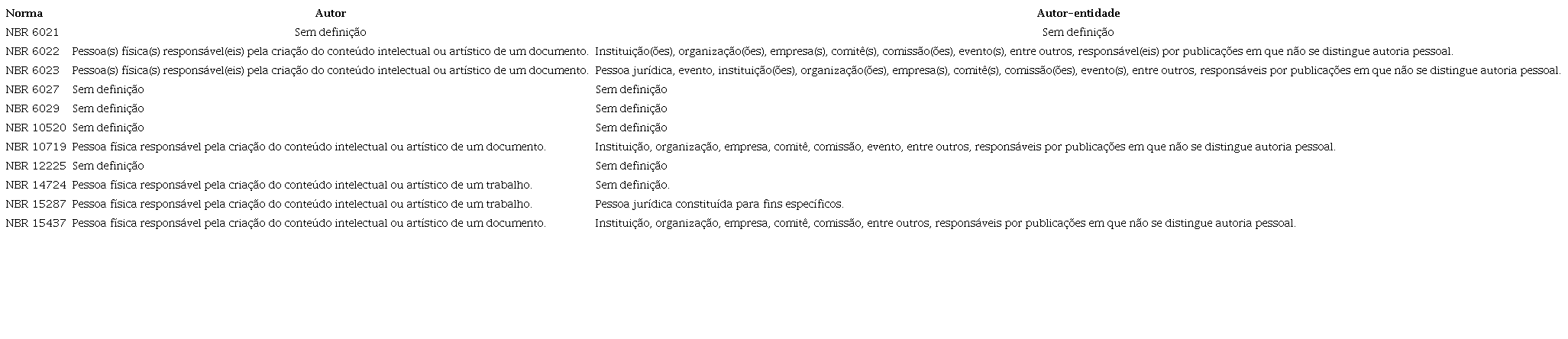 Nas NBR 6033, 6021 e 12225 também não consta a definição, mas elas falam do autor na estrutura do documento. Já a NBR 6021 traz a editora como responsável não pelo conteúdo intelectual, mas sim pela produção e distribuição. Para melhor sintetizar a questão da autoria nas normas encontradas, as definições estão compiladas no Quadro 1.