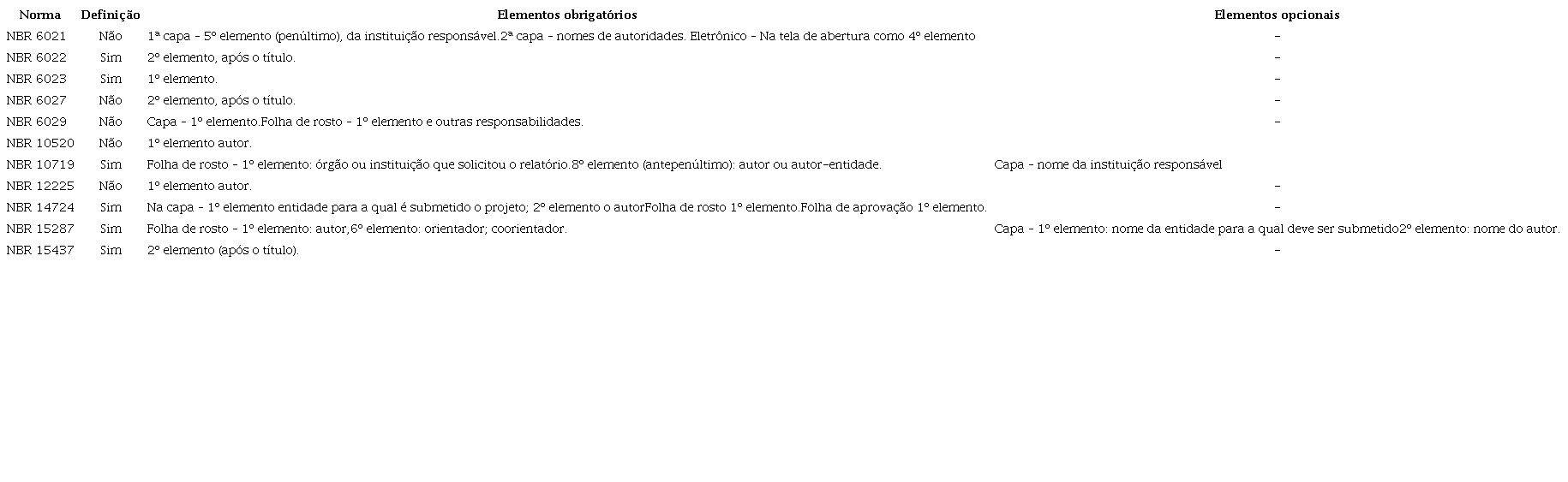 Associação Brasileira de Normas Técnicas. NBR 6027: informa-ção e documentação: sumário: apresentação. Rio de Janeiro: ABNT, 2012.