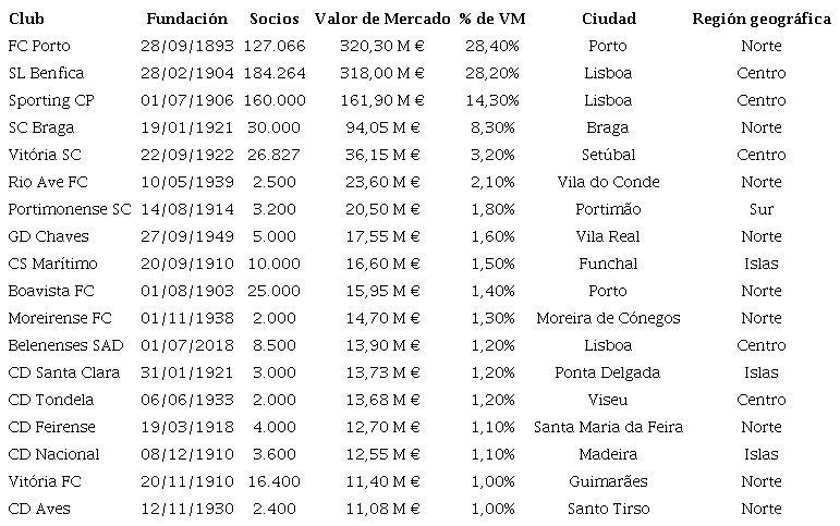 A partir de la Tabla 1 vemos como el FC Porto es el que tiene el mayor valor de mercado (320,30 M€), mientras que el CD Aves tiene el menor valor de mercado (11,08 M€). En cuanto al número de socios, es el Sport Lisboa Benfica el que presenta el mayor número de socios, con 184.264. También se puede ver que, de los clubes presentes, el que se fundó primero fue el Boavista FC en el año 1903. Viendo el panorama nacional de los clubes que forman parte de esta competición, según su ubicación pueden clasificarse en clubes del norte de Portugal (9), clubes del sur (5), clubes del centro (1) y clubs de islas (Madeira o Azores) (3).