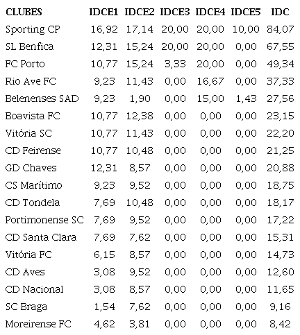 En lo que se refiere a los índices de divulgación en cada club (IDC), en la Tabla 3 se puede observar el ranking de los clubes con respecto al nivel de información divulgada. De la información divulgada, Sporting CP (84,07%) es el primer club del ranking, seguido de SL Benfica (67,55%) y FC Porto (49,34%). Los clubes que ocupan las últimas posiciones del ranking son Moreirense FC (8,42%), SC Braga (9,16%) y CD Nacional (11,65%). Puede observarse que, excepto dos, los clubes divulgan por debajo del 50%, siendo los más divulgados los clubes cuyo valor de mercado es superior.