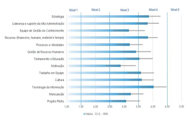 Considerando estes relatos e mediante ao limiar estabelecido por Gliem e Gliem (2003), optou-se em manter as variáveis e indicadores cujo Alfa de Cronbach foi menor que 0,51, assim como realizado em Berlato (2019). Porque o número de variáveis (afirmativas) destes indicadores (dimensão) são três, o que afeta este coeficiente (Field, 2009). Não obstante, Stadler, Sailer e Fischer (2021) anunciam que mediante a situações desta natureza cabe argumentar quanto a manutenibilidade dos itens. Assim, destaca-se que esse resultado é oriundo das percepções dos respondentes, pois alguns discordam (escala 1) de afirmativas que outros concordam veementemente (escala 5). Isso é benéfico e, portanto, aceitável, pois os indivíduos possuem perfis heterogêneos e atuam em áreas divergentes, o que tende a culminar em óticas destoantes. A manutenção das variáveis e indicadores também se justifica pelo fato do instrumento ter sido validado por especialistas da área (Corrêa et al., 2021). Ademais, há consistência interna na maioria dos indicadores e, por oportuno, destaca-se que para apreensão do nível de maturidade em GC faz-se uso da média. Nestes mesmos indicadores, têm-se o KMO e o r de Pearson destoantes, sendo esses considerados em detrimento ao anunciado anteriormente. Face ao exposto, segue-se para o entendimento do nível de maturidade em GC por dimensão (Tabela 3).