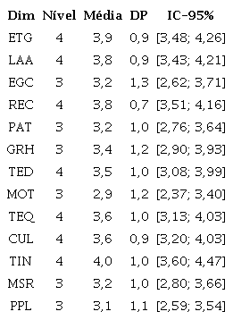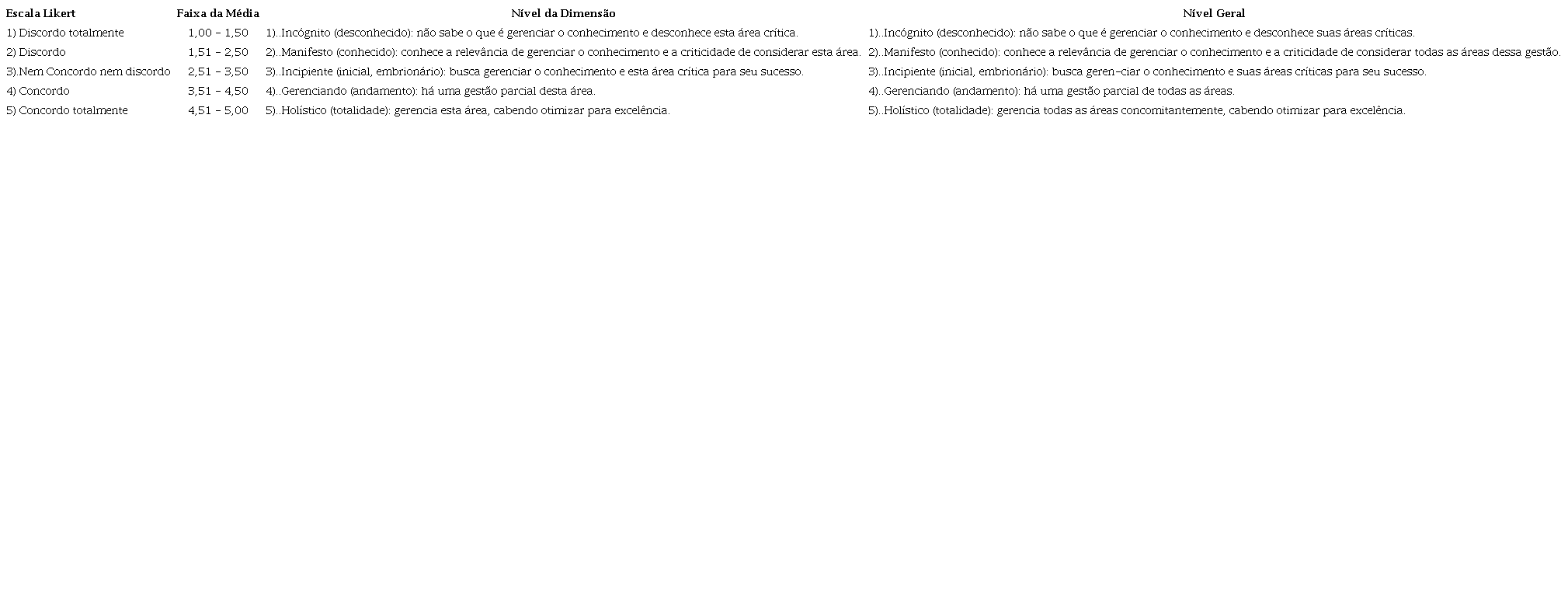 Diante do crivo estatístico dos indicadores, segue-se para a aferição da maturidade em GC (passo 3), sendo feito o uso de Média, Desvio Padrão e Intervalo de Confiança. A média é obtida pela análise das variáveis (afirmativas) inerentes a cada indicador (dimensão), enquanto o Desvio Padrão expressa o quanto os dados se afastam da Média. O Intervalo de Confiança de 95% exprime que se a mesma pesquisa for realizada posteriormente em populações com as mesmas características, com 95% de confiança o valor da média se apresentará entre o valor deste intervalo (Hair et al., 2009). Mediante a escala Likert empregada, a média apresenta a seguinte relação para com o nível de maturidade em GC (Tabela 1).