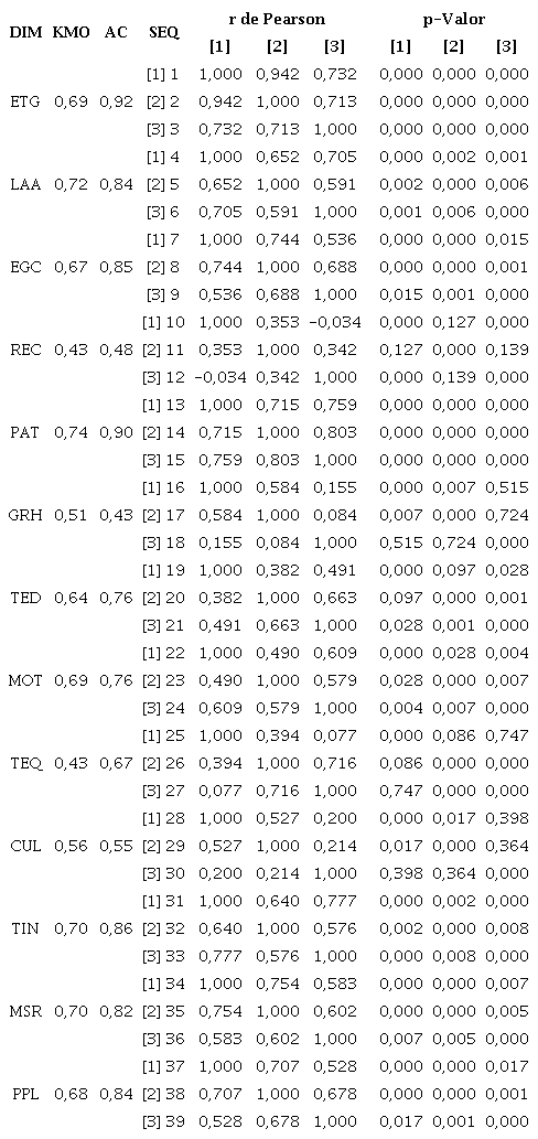 Por conseguinte, emprega-se a abordagem quantitativa para validação dos 13 indicadores (etapa 2) promulgados pelo questionário aplicado. Para esta análise, tem-se que cada dimensão constitui um indicador, sendo esses conformados por três variáveis (afirmativas) cada. Estatisticamente, para determinar indicadores Hair et al. (2009) assinala que devem ser considerados quatro aspectos: definição conceitual, dimensionalidade, confiabilidade e validade. A definição conceitual consiste na Validação de Conteúdo, sendo essa realizada na pesquisa de Corrêa et al. (2021), como supracitado. A dimensionalidade visa garantir que a variável meça apenas o indicador (dimensão) no qual está situada, sendo empregado o critério de Kaiser-Meyer-Olkin (K.M.O.), cujo resultado deve ser superior a 0,50 para o indicador (Nunes; Monteiro. Nunes, 2020). A confiabilidade é a capacidade de uma variável medir, fielmente, o indicador em questão, sendo utilizado o Alfa de Cronbach, cujo “limite inferior [...] geralmente aceito é de 0,70, apesar de poder diminuir para 0,60 em pesquisa exploratória” (Hair et al., 2009, p. 26), embora seja aceito superior a 0,51 (Gliem; Gliem, 2003). A validade certifica que a variável meça o que se propõe a medir, sendo utilizado o r de Pearson junto ao p-Valor, devendo o primeiro ser positivo entre as variáveis (afirmativas) do indicador (dimensão) e o segundo menor que 0,05 para expressar significância (Formiga, 2018).