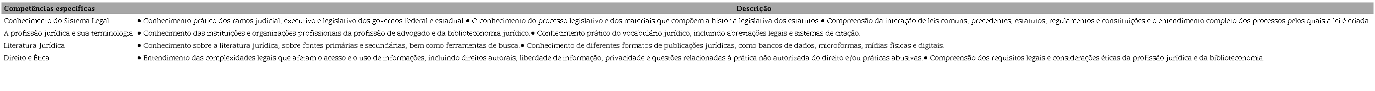 Em 1988, a AALL publicou as suas orientações para os programas de pós-graduação em biblioteconomia jurídica (AALL, Guidelines For Graduate Programs In Law Librarianship). As orientações foram divididas entre gerais e específicas, sendo essas últimas aquelas que descrevem as competências relacionadas ao conhecimento jurídico que os bibliotecários devem possuir, conforme o Quadro 1: