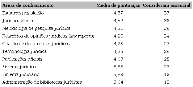 Partindo de outro ponto de vista, Corrall e O’Brien (2011), em pesquisa realizada no Reino Unido, propuseram a 62 profissionais que dessem notas de 1 a 5 em 21 áreas de conhecimento jurídico diferentes que seriam necessárias ao bibliotecário jurídico, em que 1 seria uma área “não necessária”, e 5, “essencial”. Os 10 campos de conhecimento jurídico mais apontados como “essenciais” foram os indicados no Quadro 2: