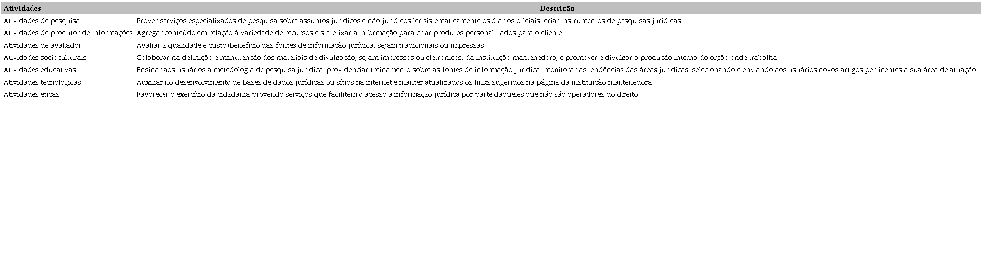 Por sua vez, o Quadro 3, com seus grupos de atividades de pesquisa, de produtor de informações, de avaliador, socioculturais, educativas, tecnológicas e éticas, sugere que são necessários, respectivamente, conhecimentos em: (8) pesquisa em fontes de informação jurídicas; (9) criação de recursos jurídicos personalizados voltados para o usuário; (10) avaliação de fontes de informação; (11) divulgação de material para os usuários; (12) treinamento de usuários; (13) uso e atualização de bases de dados jurídicas; (14) elaboração de serviços para acesso ao público não especializado à informação jurídica.