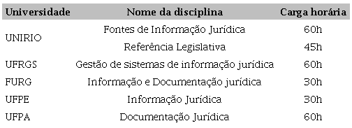 Nenhuma das disciplinas identificadas faz parte do currículo obrigatório dos cursos, aparecendo sempre como optativas nas matrizes curriculares consultadas. A carga horária das disciplinas varia significativamente, dependendo da instituição, porém a maioria delas lhes dedica mais do que 45 horas durante o semestre. A diferenciação de carga horária foi apresentada por sugerir maior ou menor grau de profundidade dado aos aspectos da informação jurídica em sala de aula.