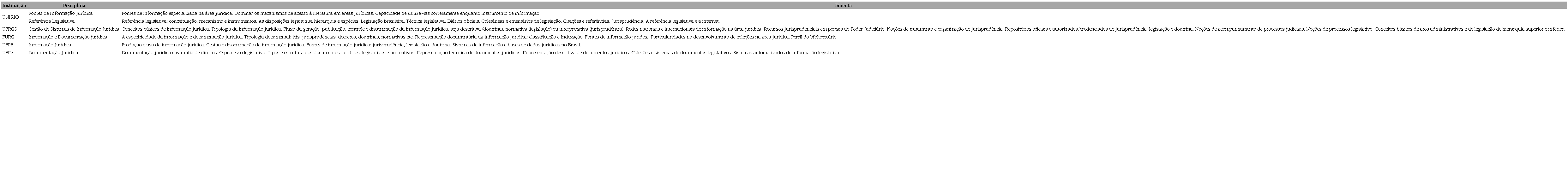 Portanto, na análise das ementas das disciplinas voltadas à informação jurídica, buscou-se encontrar os 14 itens aqui elencados, entendendo-os como essenciais à luz dos autores citados.