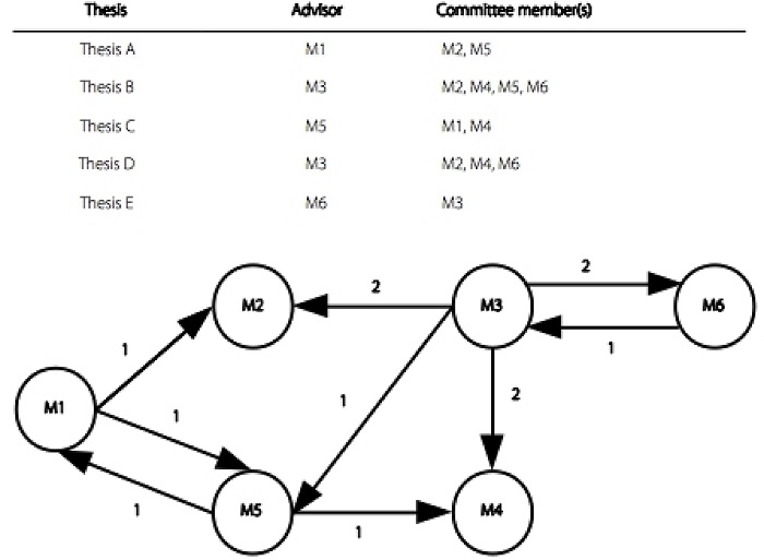 In order to illustrate how the structure of academic committees can be designed, Figure 1 displays a model of an invitation dynamics network. The table on the left shows a set of five hypothetical theses assessment committees, each with its advisor and constituent members (identified by M1 to M6). In the network (graph), on the right, each vertex represents a committee member, and invitations are indicated by arcs, which always connect the inviter to the invitee. The figure linked to each arc represents the number of invitations sent by the inviter (and held by the invitee).