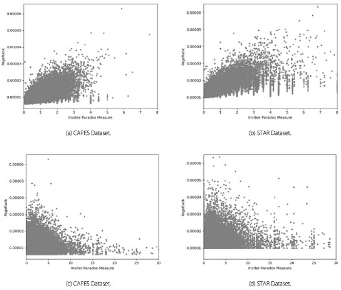 In Figure 5, it is possible to note a trend in the increase of the ranking as the measure of the Invitee Paradox also progresses (subplots (a) and (b)). The results suggest that, as members receive more invitations in relation to their peers, the greater their relative importance in the network. This evidence is corroborated by Pearson’s correlation coefficient, for both the Capes chart (strong correlation with 0.68) and the STAR chart (moderate correlation with 0.54). As for the correlation between the measure of the Inviter Paradox and the PageRank metric (subplots (c) and (d)), we found that it is weak for the Capes chart (0.30) and very weak for the STAR chart (0.19). P-value was very close to zero in all cases, meaning that our tests were statistically significant.
