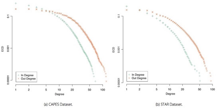 The charts in Figure 5 display the in-degree and out-degree values of both datasets by means of the Empirical Cumulative Distribution (ECD) function (Katchanov; Markova, 2017). We can clearly see that most members have low degree values, while only a few of them have high degree values (as should be expected), with similar curve patterns between the two datasets.