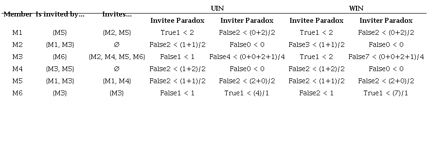 In the example of Table 1, the Inviter Paradox is only valid for the M6 member, in both UIN and WIN. The Invitee Paradox is only valid for M1 in UIN, and M1 and M3 in WIN. We can state that the number of invitations between any two members did not substantially influence the assessment of the paradoxes in either of the networks, except for the Invitee Paradox for the M3 member.