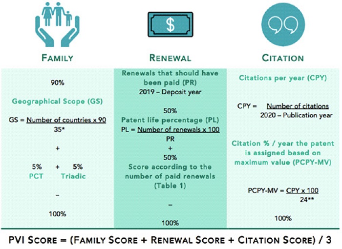 The PVI equations seek to contemplate the individuality of each patent concerning the full set. Thus, in the indicators relating to renewal and citations, the inventions’ lifespan and the year of publication are taken into account, respectively. Regarding patent family, intensity features such as Patent Cooperation Treaty (PCT) application and triadic family are accommodated.
