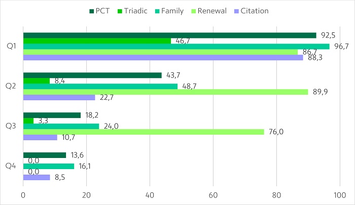 The first step was to assess the presence of the value indicators – family, PCT, triadic, renewals and citation – in each quartile. This may initially sound biased, as it is already expected that Q1, the highest-scoring group, will present higher numbers. However, this is not an assessment of quantity, but of whether or not the indicator is present; in the case of the renewal indicator, it will be also ascertained whether the patent remains active (whether holders are keeping up with payments). Results may be seen in Figure 2 below.