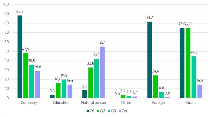 The most prominent feature in Figure 3 is the high number of patents from foreign companies in Q1: 106 companies, 98 of which are foreign. Q2 also presents significant numbers, with 57 patents belonging to companies, 29 foreign ones. In Q3, there is a balance between patents belonging to companies (43) and natural persons (51); only 8 foreign holders are in this quartile. In Q4, the number of natural-person depositors is higher (65); only one is foreign.