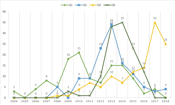 It is observed that Q1 has the oldest patents; it peaks in the 2010, with 21 records, as indicated by the blue line. Another curious fact is that Q1 has more patents filed before the Green Patents Program (PPV) was launched (2012) than after: 68 patents from 2004 to 2011 and 52 from 2012 to 2018.
