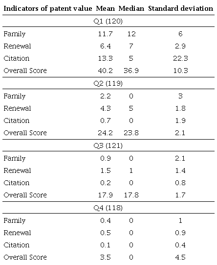 Table 1 shows that family and citation indicators are concentrated in Q1, reaching much higher mean and median than other quartiles. In addition, Q1 also stands out regarding data discrepancy, with a high standard deviation, especially in the citation indicator. This may demonstrate the existence of patents that display a much higher volume of the indicators evaluated than other patents in the group. This determinant may also be seen in the maximum and minimum scores each patent received in each quartile, with Q1 scores ranging from 80.3 to 28.6 – the highest span among the four groups.