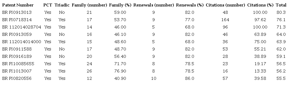 The ten best-evaluated patents have PCT application, six of them have triadic families and the invention was protected in 12 to 26 different countries. Regarding paid renewals and their percentage, it is also necessary to see Table 3 below; these patents were filed between 2007 and 2013, and only one is inactive. These inventions received 16 to 164 citations over the years; the lowest citation record per year (counted from the date of publication) was that of patent BR PI1013007 with 3.2, and the largest were those of patents BR PI0913013 and BR 112014028704, with 24 citations per year.