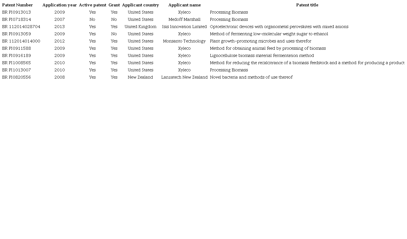 As for other features of these patents, two were not granted in Brazil; the holders are all foreign, with a predominance of companies from the United States, especially Xyleco, with inventions involving biomass processing. Further details on patent features may be seen in Table 3 below.