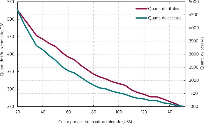 Verificou-se que a quantidade de títulos com alto índice C/A variou de 526 (54,7%) a 250 (26%), enquanto o custo máximo aceito por acesso é de US$ 20 a US$ 150. Já o número de acessos considerados “caros” varia de 4.685 a 1.018, respectivamente.