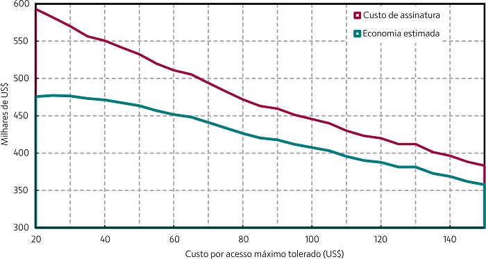 Ao observar a Figura 2, percebe-se que, mesmo subindo o valor máximo considerado aceitável para o índice C/A, o valor estimado para a economia resultante não varia tanto. Isso decorre do fato de a maior parcela de gastos exagerados em assinaturas de títulos estar bem acima do limite estipulado e, portanto, não ser muito impactada pela variação desse limite.