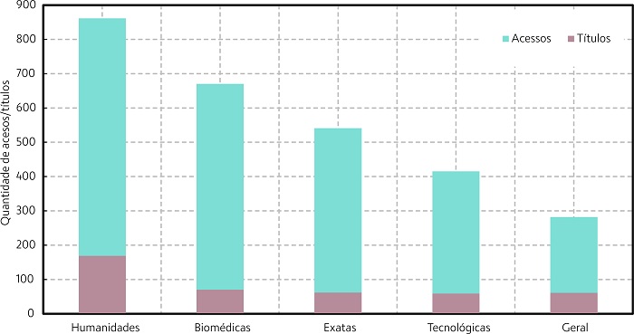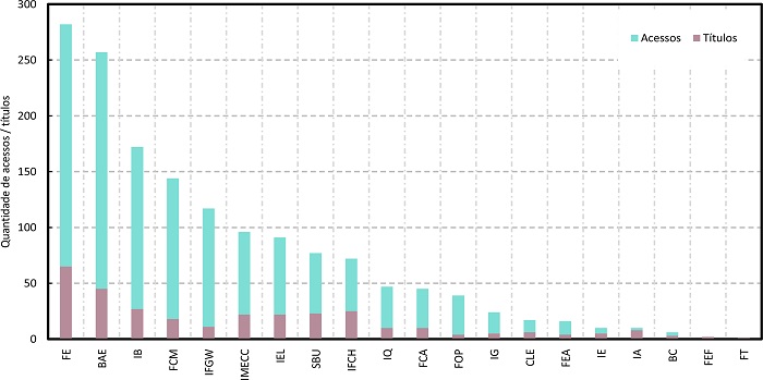 Como forma de distribuir a carga de trabalho gerada com as aquisições de artigos de periódicos sob demanda, essas solicitações deveriam ser processadas de forma distribuída pelas unidades. Nesse sentido, é interessante observar como essa distribuição impactaria cada uma das unidades do SBU. A Figura 3 exibe justamente a distribuição de acessos e títulos por grandes áreas, e a Figura 4 desmembra esses dados por unidades.