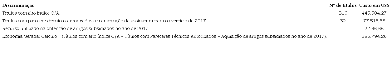 Diante do exposto, foi estabelecida pelo SBU a implantação da nova modalidade de acesso, com custo subsidiado pela Universidade, aos títulos de periódicos cujo valor do índice C/A estivesse acima do limite (US$100) e que tivessem menos de 40 acessos cada. Em outras palavras, os artigos publicados nos periódicos que deixaram de ser assinados passaram a ser adquiridos de forma avulsa. Para tanto, foi destinado um fundo de U$80.000,00 para a aquisição sob demanda de artigos desses periódicos para docentes, pós-graduandos e pesquisadores da Unicamp. Contudo, desse fundo, no ano de 2017, foi utilizado apenas US$2.196,66. A Tabela 1 apresenta a economia gerada com a implementação do estudo.