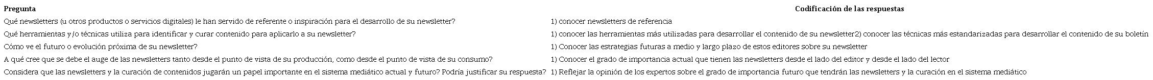 A su vez, las preguntas se han diseñado tomando en consideración objetivos específicos de esta investigación y las respuestas se han registrado a través de correo electrónico y/o a través de grabación sonora y posteriormente se han transcripto. Seguidamente, se han codificado (Cuadro 2) y analizado los resultados a través del software de análisis cualitativo ATLAS.ti (Paulus; Lester, 2015; Lopezosa; Codina; Freixa, 2022).