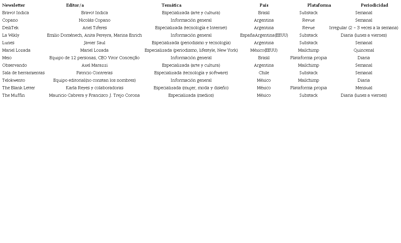 En el Cuadro 3 se pueden observar algunos datos generales de interés de los boletines estudiados, como la identificación de sus editores, el país, la temática, la plataforma de publicación y la periodicidad. Se aprecia, así, una cierta variedad temática, que incluye 4 boletines de información general, siendo el resto especializados en temas diversos, con presencia repetida de arte y cultura, periodismo y tecnología. Como software se emplea de manera mayoritaria Substack (en 5 boletines), y también Mailchimp, Revue y plataforma propia, y en cuanto a periodicidad, predomina la diaria y la semanal, con casos aislados de quincenal, mensual e irregular