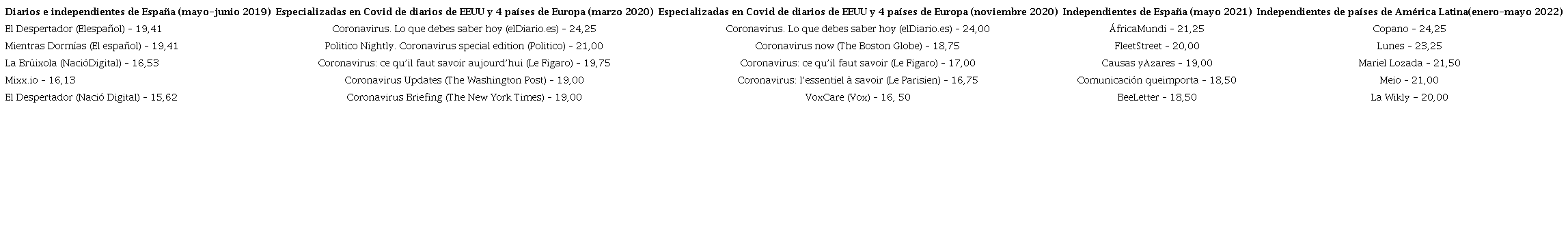 Si comparamos los resultados de CAS de este estudio con los de investigaciones anteriores (véase un resumen en la Tabla 1 de los 5 primeros boletines de los rankings en diferentes trabajos), se observa que las newsletters latinoamericanas analizadas se encuentran a un nivel alto, igualando Copano, con 24,25 puntos, la puntuación más alta obtenida hasta el momento, la del boletín Coronavirus: lo que debes saber hoy, de El diario.es, y mejorando ligeramente los boletines estudiados los mejores registros de las newsletters independientes españolas analizadas anteriormente. Además, se aprecia en general una progresión claramente al alza entre las puntuaciones del estudio más antiguo y el más reciente. Todo ello se puede interpretar, por una parte, como la confirmación del buen desempeño de la curación de contenidos en los boletines independientes, y por otra, aún con todas las precauciones posibles, como una mejora en la calidad de la curación en boletines durante el período 2019-2022 que cubren los estudios señalados.