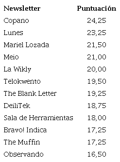 En primera posición del ranking resultante del análisis de la curación de contenidos en newsletters se encuentra Copano con 24,25 puntos, obteniendo en cuatro de los ocho apartados analizados la máxima puntuación, y siendo por tanto la mejor en nuestro análisis. El segundo puesto lo ocupa Lunes (23,25), que se destaca por ser el boletín con mejor puntuación en el apartado de técnicas de sense making. En posiciones cercanas se encuentran Mariel Lozada, Meio y La Wikly. Las posiciones inferiores de The Muffin y Observando se pueden explicar, en el primer caso, por ser un boletín muy centrado en contenido de creación (interpretación y opinión) por encima de contenido curado, y en el segundo caso, por la baja puntuación en los apartados de sense making y tratamiento informativo de las fuentes.