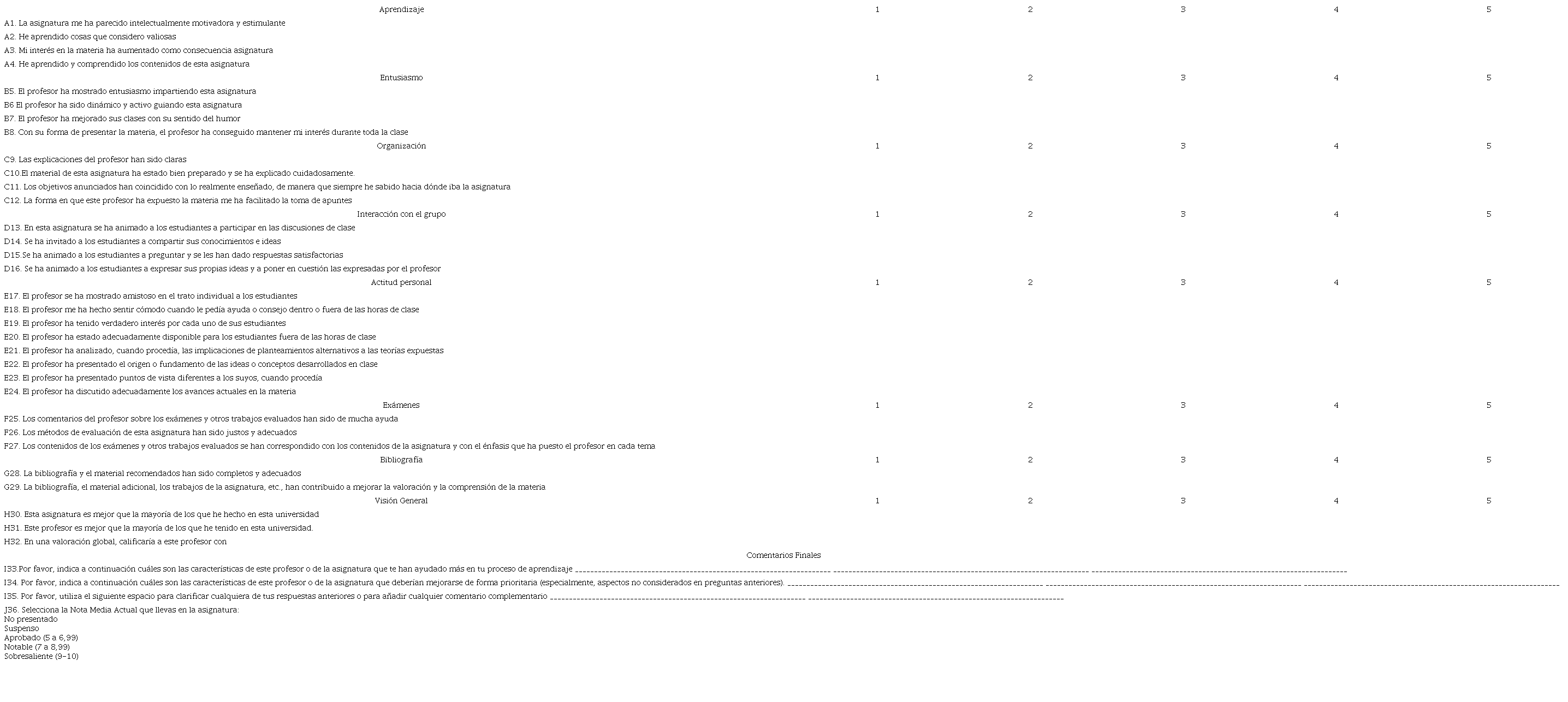 El instrumento usado es el cuestionario SEEQ, que valora la efectividad del proceso de enseñanza-aprendizaje basado en la percepción de los estudiantes y se encuentra formado por 31 preguntas valoradas en una escala de Likert y agrupadas en 8 dimensiones: