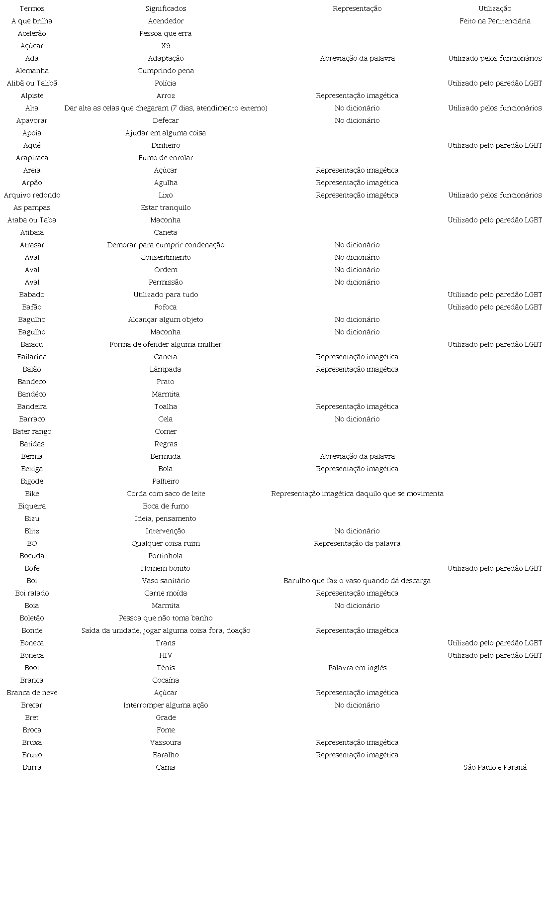 Em uma primeira análise, é perceptível a presença de algumas palavras no dicionário. Outras palavras são a representação imagética do termo, como, “vaquinha” significa “leite” e “visor” significa óculos. E outras palavras são uma abreviação do termo, exemplo: RQ significa Rabo Quente, uma espécie de resistência feita dentro da própria cela ou, então, PH, que significa Papel Higiênico.