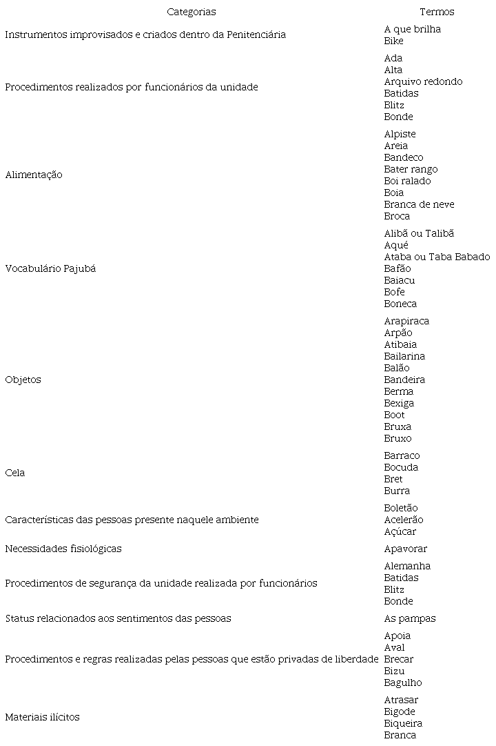 Com base nos termos aqui apresentados, 12 categorias foram desenvolvidas, são elas: (1) Instrumentos improvisados e criados dentro da Penitenciária: com objetos adquiridos dentro da instituição; (2) Procedimentos realizados por funcionários da unidade; (3) Alimentação: incluindo alimentos, procedimentos para que a alimentação aconteça e objetos relacionados a alimentação; (4) Vocabulário Pajubá: termos utilizados por mulheres transexuais e travestis; (5) Objetos; (6) Cela: estrutura das celas; (7) Características das pessoas presente naquele ambiente; (8) Necessidades fisiológicas; (9) Procedimentos de segurança da unidade realizada por funcionários; (10) Status relacionados aos sentimentos das pessoas; (11) Procedimentos e regras realizadas pelas pessoas que estão privadas de liberdade; e (12) Materiais ilícitos.