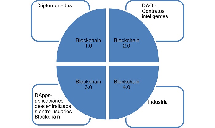 En una primera fase este protocolo generó la creación de criptomonedas concebidas por Satoshi en el 2008. En la segunda, se contempló su uso en la financiación de proyectos de carácter tecnológico. En la tercera, se observa su potencial para garantizar la trazabilidad en el sector financiero, donde se rastrean transacciones en un determinado mercado, lo cual aminora representativamente las asimetrías de información ya que cualquier individuo puede consultar la transacción de su interés, conociendo los detalles de una forma menos compleja y sin que la obtención de los datos incida en el incremento de costos de la misma (Corredor; Días, 2018). Finalmente, se extiende a todos los sectores industriales apoyada en aplicaciones distribuidas (DApps) y los contratos inteligentes (Smart Contracts) los cuales tienen una dirección, múltiples variables y funciones de lectura y escritura (Su; Wang; Kim, 2018), y además, aportan valor a la red verificando sucesos entre las partes en torno al objeto de negociación en tiempo real, considerándose como un protocolo creado para facilitar y reforzar una negociación cuya funcionalidad es proporcionar confianza en transacciones en línea, permitiendo que los usuarios realicen operaciones entre sí (Petroni; Monaco; Franco, 2018). Asimismo, define reglas, acuerdos y sanciones en las negociaciones operando de la misma forma que un contrato tradicional del cual se derivan obligaciones y responsabilidades entre los participantes. Los mismos propician que las decisiones se tomen de forma participativa y que las acciones se ejecuten de forma automática, transparente y sin intervención humana (Parrondo, 2018). La figura 1 ilustra las fases descriptas.