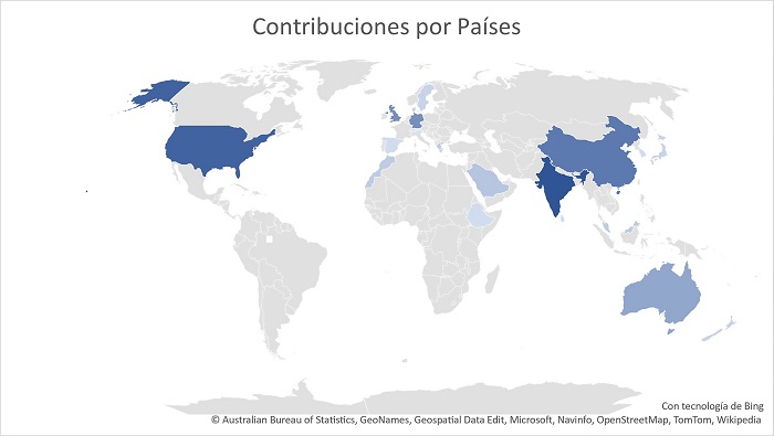 En la Figura 2 se muestran los primeros 20 países que han contribuido con más publicaciones en este tema, identificados con color azul fuerte, países como India, Estados Unidos, China, Alemania y Reino Unido. Existe contribución en menor proporción en países como Australia, Arabia Saudita, Grecia y Malasia.