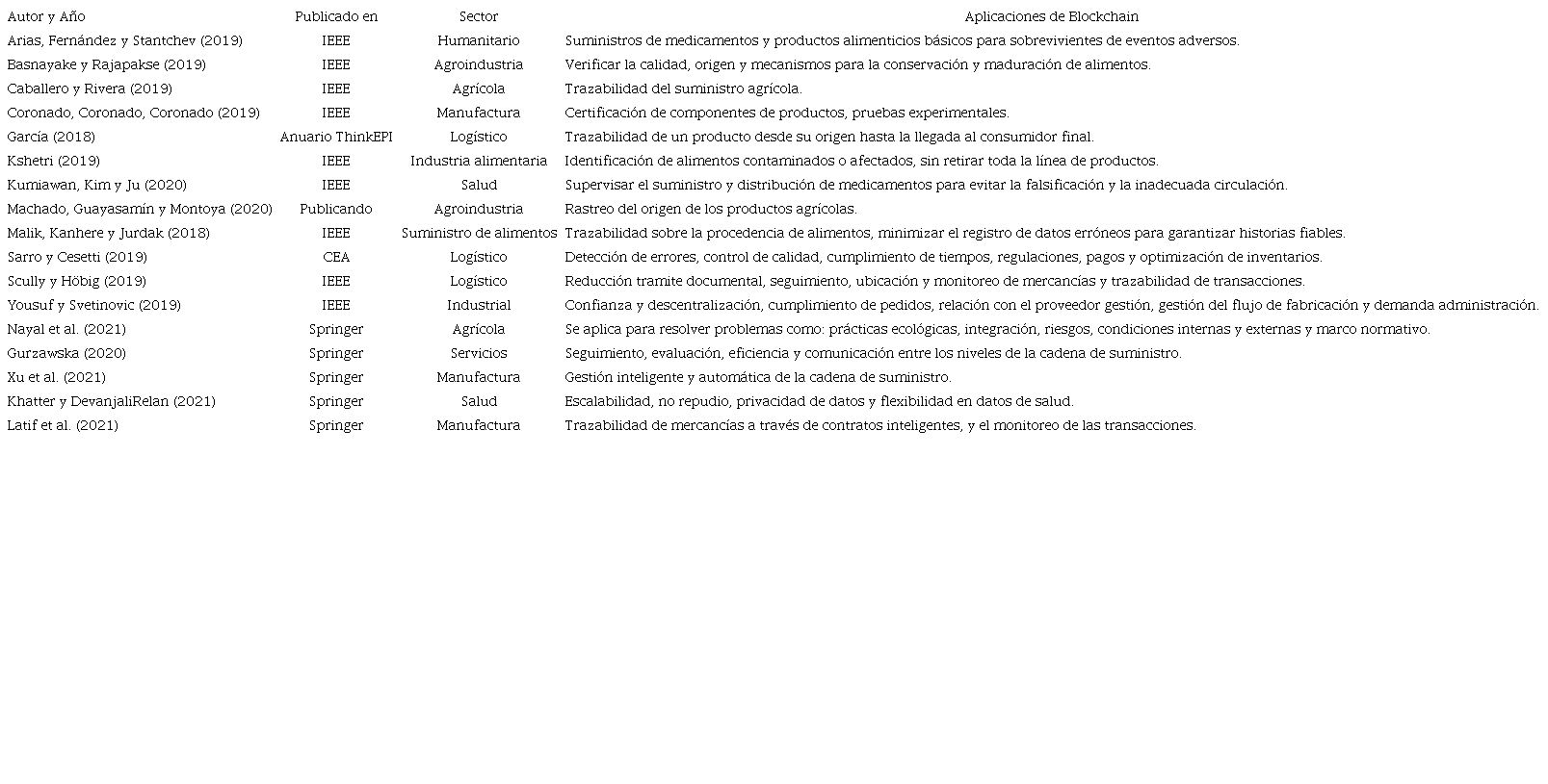 En la tabla 1 se muestra un mapeo de las aplicaciones que resumen: autores, lugar de publicación, el sector y la descripción de aplicación de la Blockchain. Para ello se tomó una muestra de 17 artículos en su mayoría de revistas y conferencias organizados por la IEEE y publicaciones recientes de Springer.