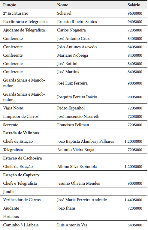 Em outras funções, tais como as de portador, foguista, manobrador, ajustador, lenheiro e a turma de guarda freios podemos perceber o movimento de especialização de funções e consolidação da divisão do trabalho. O portador tinha como serviço a carga e descarga de mercadorias, já o foguista era o responsável por colocar lenha na caldeira da máquina. O manobrador tinha como função engatar desengatar e virar a chave, o lenheiro era responsável pelo abastecimento das máquinas com lenhas de todas as máquinas que chegavam de viagem. O ajustador era responsável por fazer toda a revisão da máquina. Se comparamos com o quadro funcional apresentado na Tabela I a fragmentação das atividades fica ainda mais evidenciada.