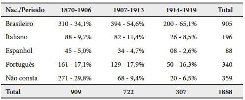 Segundo os dados por nós coletados junto aos prontuários funcionais da CPEF, falar de trabalhador estrangeiro é falar principalmente de portugueses. Os dados da Tabela III indicam a relação entre nacionalidade dos trabalhadores e período de admissão considerando os prontuários funcionais pesquisados.