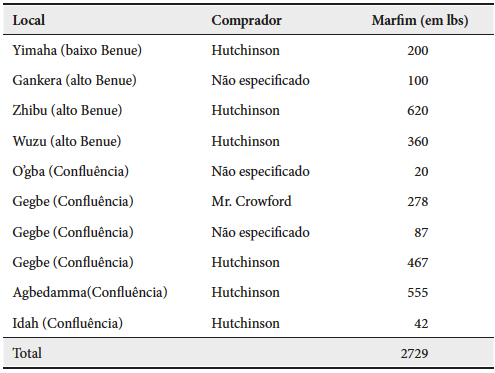 A maior parte da mercadoria, entretanto, foi comprada próximo à confluência, na viagem de retorno, já que durante a subida do rio, apenas esporadicamente conseguiram encontrar marfim a venda.28 De fato, um grupo foi deixado em Gbebe para estabelecer um ponto fixo de comércio, mas em duas semanas tinham comprado apenas 278 libras, uma vez que Crawford, o agente que estava encarregado das compras em Gbebe não tinha autonomia para pagar acima do valor estipulado, que estava abaixo do preço do mercado.29