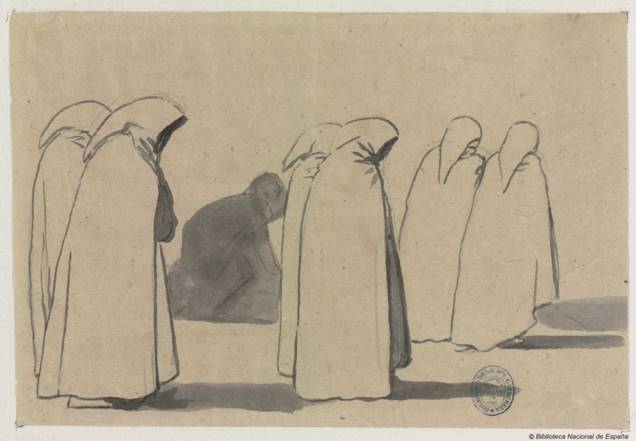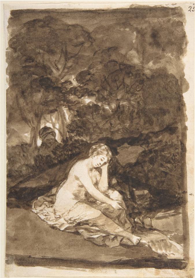 Enquanto a originalidade e diferença de Goya em relação aos seus contemporâneos e antecessores, é inegável que ele deu ao desenho uma importância incomum para a época; formando álbuns de obras em si mesmas, o que não parece ter sido praticado por outros artistas. Mas também é verdade que, sobre o uso de diferentes técnicas ou meios de aplicação infrequentes, Goya não foi o único a experimentar ou adaptar suas preferências. Seu extraordinário uso do pincel foi já comentado em diversas ocasiões, mas sem se referir a outros artistas como Luis Paret y Alcázar (1746-1799) ou José Camarón Bonanat (1731-1803), que também o manejaram com muita liberdade, criando linhas fluidas e conseguindo efeitos lumínicos eficazes e surpreendentes. Além disso, para Camarón era muito comum usar o pincel em seu método de trabalho, mesmo para a preparação de estampas ou ilustrações, como Goya também fez em alguns dos desenhos preparatórios para suas séries de gravuras dos Caprichos, Desastres ou Disparates.14 Por outro lado, não se pode discutir que a forma de desenhar dos dois artistas é completamente diferente. Se bem a forma de desenhar de Camarón era fundamentalmente Rococo, tornando-se um dos maiores representantes deste estilo na Espanha -com Paret em muitas de suas obras-, a maneira de Goya era pessoal, e se alimentava de várias fontes: dos traços livres e fluidos dos napolitanos, que iria aprender na Academia de Zaragoza e na estada italiana; mas também de Tiepolo e sua reverência para os efeitos lumínicos nas obras. Goya praticou a experimentação com as técnicas de desenho, fazendo uma escolha daquelas que se acomodavam melhor as suas obras, e davam-lhe um melhor recurso expressivo.