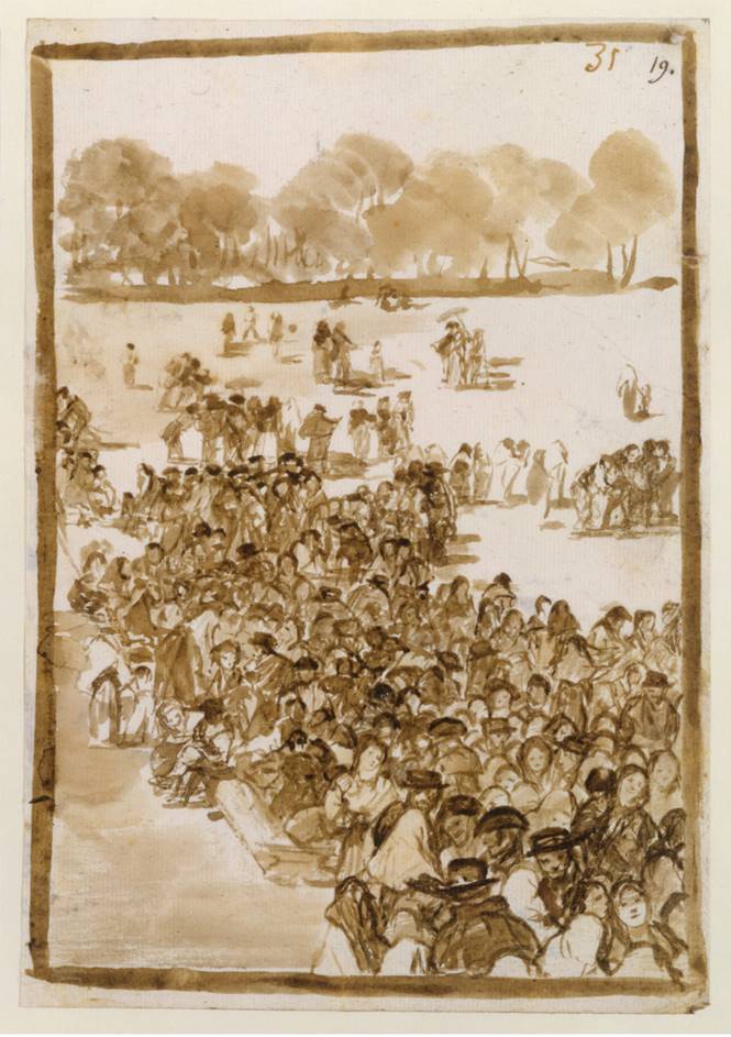 Além disso, não se pode esquecer que Goya fez muitos desenhos preparatórios para estampas, o que era uma forma muito comum de usar o desenho no século XVIII, especialmente no último terço do mesmo, quando a impressão de livros e estampas atingiu seu ápice. Se de seus quadros, ou de outras obras, Goya podia guardar os esboços, como de fato o fez -tanto para si próprio como também para vendê-los-; das estampas só podia conservar os desenhos. Esta é uma razão, pela qual ele poderia ter conservado tantos desenhos preparatórios para gravuras.13